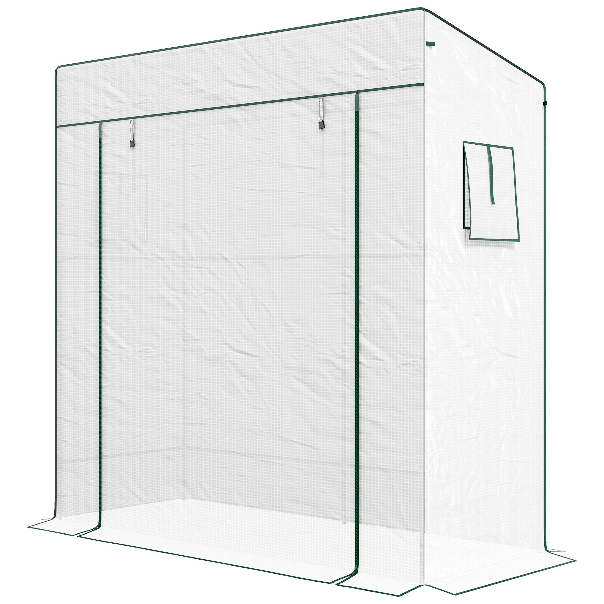 Grow a moderate variety of plants and vegetables with this 77 x 196cm Outsunny greenhouse. The plastic cover creates safe shelter inside, complete with a zipped door to access. Two windows bring in fresh air, when needed.