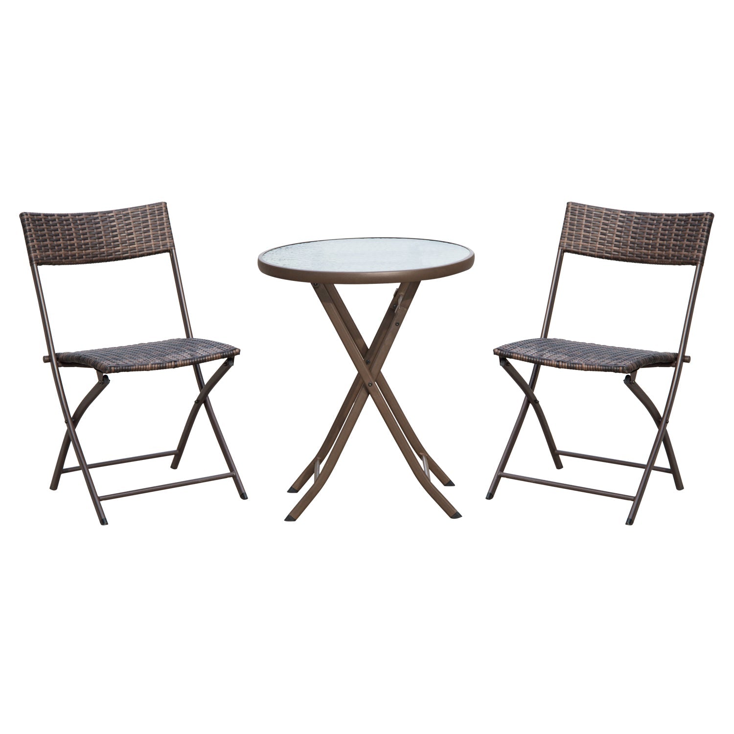 This 3-piece rattan bistro coffee set from Outsunny is an ideal solution for your garden, patio or balcony. Made with quality steel tubing and covered with PE rattan, it will last for years to come. The set consists of 1 table and 2 chairs, a suitable addition to any home with limited space. The whole set can be easily folded and stored away to create more space when not in use. Enjoy the day drinking coffee and reading your favorite book at your very own rattan garden furniture set.\n